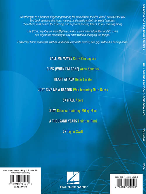 Whether you're a karaoke singer or preparing for an audition, the Pro Vocal series is for you. The book contains the lyrics, melody, and chord symbols for eight hit songs. The CD contains demos for listening and separate backing tracks so you can sing along. The CD is playable on any CD, but it is also enhanced for PC and Mac computer users so you can adjust the recording to any pitch without changing the tempo! Perfect for home rehearsal, parties, auditions, corporate events, and gigs without a backup band. This volume features 8 top hits: Call Me Maybe · Cups (When I'm Gone) · Heart Attack · Just Give Me a Reason · Skyfall · Stay · A Thousand Years · 22.