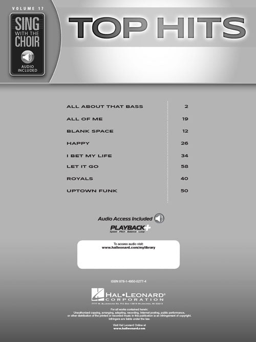 This great collection lets vocalists sing eight current hits as part of a wonderful choir! The book includes SATB parts and the online audio features full performances. Listen to the audio, open the book, pick your part, and sing along! Songs: All About That Bass · All of Me · Blank Space · Happy · I Bet My Life · Let It Go · Royals · Uptown Funk.