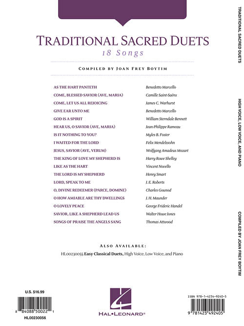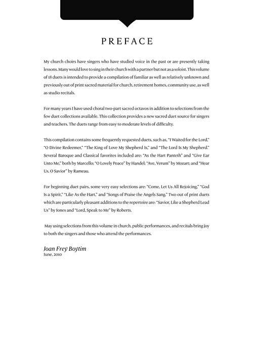 18 duets intended to provide a compilation of familiar as well as relatively unknown and previously out of print sacred material for church, retirement homes, community use, as well as studio recitals. ...a welcome resource for those singers who have the opportunity to sing classical music in their churches...The difficulty levels range from quite easy to quite difficult. There is something for everyone. Only two of the eighteen duets are indicated as arrangements. All the others are original works or works put into duet form by the composer. Once again, Joan Frey Boytim has done a good service to singers.--Journal of Singing