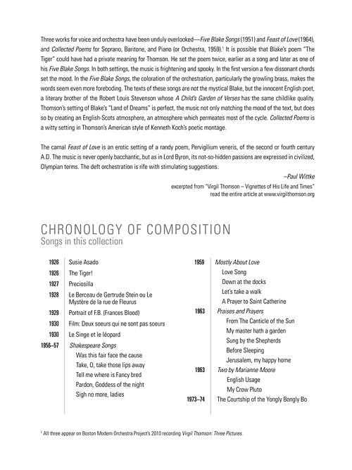This is the first substantial collection ever published of songs by Virgil Thomson (1896-1989), composer of the operas The Mother of Us All and Four Saints in Three Acts. Thomson's musical style was based in Americana, but he was attracted to abstract poetry. The unique result is traditionalism turned on its ear. The songs date from 1926 until 1974. Contents: Le Berceau de Gertrude Stein ou Le Mystère de la rue de Fleurus · The Courtship of the Yongly Bongly Bo · The Feast of Love (low voice only) · Film: Deux soeurs qui ne sont pas soeurs · Mostly about Love: Love Song; Down at the Docks; Let's Take a Walk; A Prayer to Saint Catherine · Portrait of F.B. (Frances Blood) · Praises and Prayers: From the Canticle of the Sun; My Master Hath a Garden; Sung by the Shepherds; Before Sleeping; Jerusalem, My Happy Home · Preciosilla · Shakespeare Songs: Was this fair face the cause; Take, o, take those lips away; Tell me where is Fancy bred; Pardon, Goddess of the night; Sigh no more, ladies · Le Singe et le Léopard · Susie Asado · The Tiger · Two by Marianne More: English Usage; My Crow Pluto.