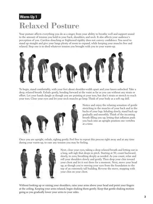 Singing requires putting the rest of your busy life aside and focusing on both the physical and creative components of making art through sound. Just like athletes, musicians must warm up to be limber, relaxed and ready to perform, and to prevent strain or injury. These 25 warm-ups are designed to take your voice and body from their everyday habits and routines and to focus and prepare them to sing well. The exercises begin with broad, large-muscle relaxation techniques and breathing work, and move on to a gradual, relaxed warm-up of your voice and strengthening of your vocal skills. The audio tracks contain demos for listening and separate backing tracks so you can sing along. Three songs are also included for practice. Audio is accessed online using the unique code inside the book and can be streamed or downloaded. The audio files include PLAYBACK+, a multi-functional audio player that allows you to slow down audio without changing pitch, set loop points, change keys, and pan left or right.