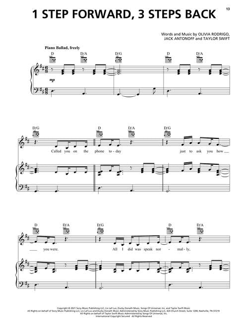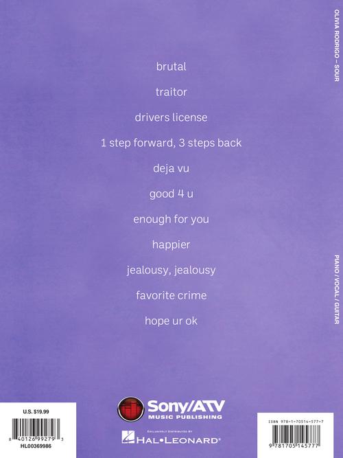 Olivia Rodrigo - SourPublisher: Hal LeonardCategory: Keyboard & Piano/Vocal/GuitarSeries: Piano/Vocal/Guitar Artist SongbookFormat: Softcover11 songs from the 2021 debut album by Disney Channel starlet Olivia Rodrigo, in arrangements for piano, voice and guitar. Our folio includes her...Regular price $27.99