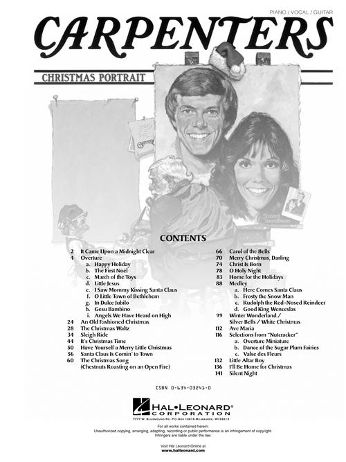 Carpenters - Christmas PortraitPublisher: Hal LeonardCategory: Keyboard & Piano/Vocal/GuitarSeries: Piano/Vocal/Guitar Artist SongbookFormat: PaperbackThis stellar collection features piano/vocal/guitar arrangements of all the songs from Karen and Richard Carpenter's million-selling 1978 Christmas album. Includes 36 of the season's...Regular price $33.99 -