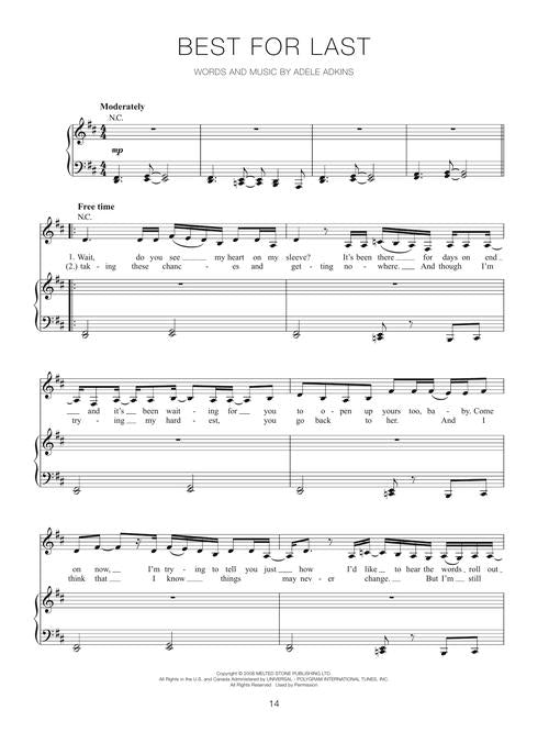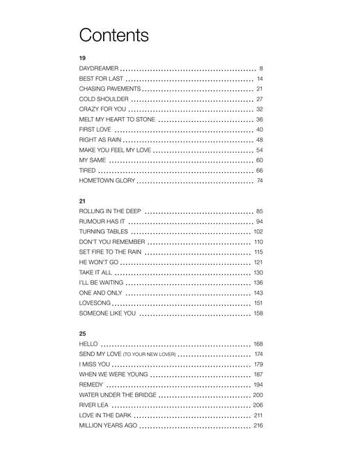 Adele - The Complete CollectionPublisher: Hal LeonardCategory: Keyboard & Piano/Vocal/GuitarSeries: Piano/Vocal/Guitar Artist SongbookFormat: SoftcoverThis definitive songbook presents, for the very first time, all the songs from Adele's four chart-topping albums in a single volume. Other bonus...Regular price $59.99 -