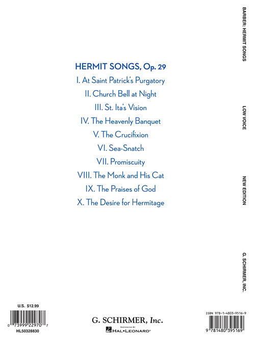 Hermit SongsLow Voice, New EditionPublisher: G. Schirmer, Inc.Category: ClassicalSeries: Vocal CollectionFormat: SoftcoverThis new edition includes detailed prefatory notes on the songs and new music engravings. Contents: At Saint Patrick's Purgatory · Church Bell At Night ·...Regular price $17.99 -