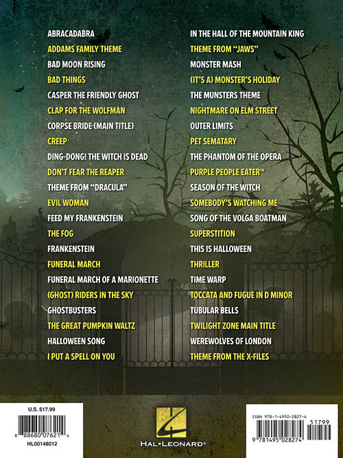 The Big & Scary Halloween SongbookPublisher: Hal LeonardCategory: Keyboard & Piano/Vocal/GuitarSeries: Piano/Vocal/Guitar SongbookFormat: SoftcoverA frightfully delightful collection of 44 spooky tunes in piano/vocal/guitar arrangements. Includes: Addams Family Theme · Bad Things · Corpse Bride (Main Title)...Regular price $33.99