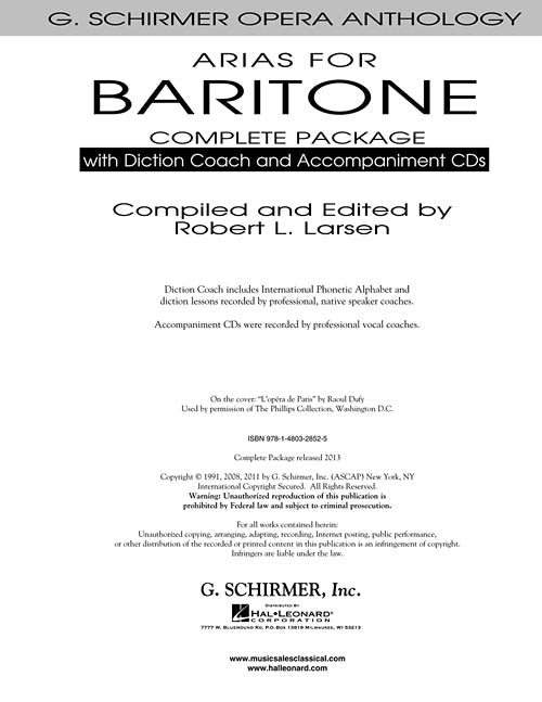 Arias for Baritone - Complete Packagewith Diction Coach and Accompaniment CDsPublisher: G. Schirmer, Inc.Category: VocalSeries: Vocal CollectionFormat: Softcover with CDThis all-in-one package includes the original Arias for Baritone book from the G. Schirmer Opera Anthology along...Regular price $63.99 -