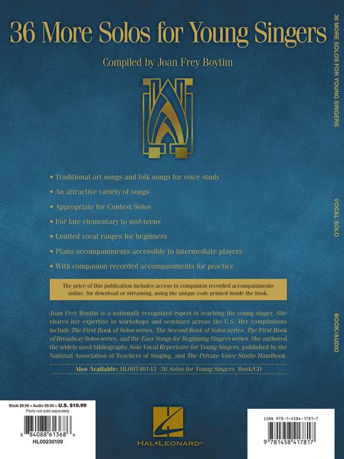 36 More Solos for Young SingersPublisher: Hal LeonardCategory: VocalSeries: Vocal CollectionFormat: Softcover Audio OnlineBuilding on 36 Solos for Young Singers (available as HL00740143), this collection contains traditional and folk songs with limited ranges for late-elementary to...Regular price $23.99