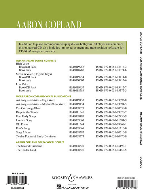Aaron Copland: Old American Songs CompleteMedium Voice (Original Keys)Publisher: Boosey & HawkesCategory: VocalSeries: Boosey & Hawkes VoiceFormat: Softcover Audio OnlineThe two sets of Old American Songs are beloved, standard vocal literature. This edition combines both sets...Regular price $29.99 -