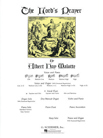 The Lord's PrayerSoprano/Alto DuetPublisher: G. Schirmer, Inc.Category: ClassicalSeries: Vocal EnsembleFormat: PaperbackSheet MusicInventory # : 50284230UPC: 73999315707ISBN: Width: 9"Length: 12"Height: 0.023"Product Weight: 0.1 lbs.Number of Pages: 8 Condition: New Item# 50284230 Authorized DealerRegular price $5.99