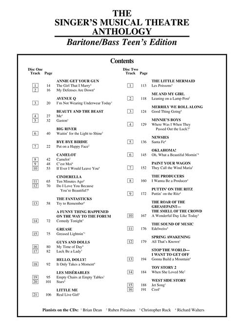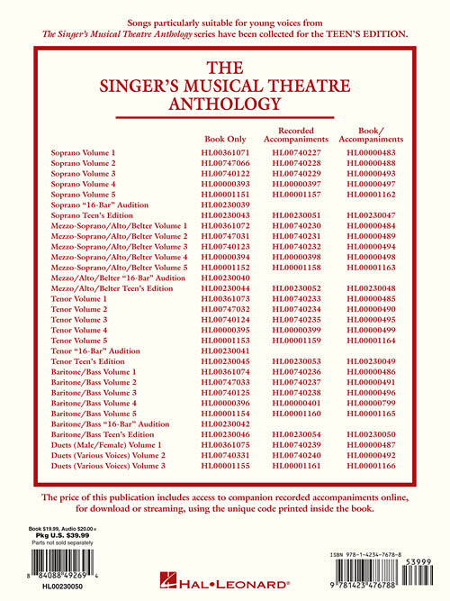 The Singer's Musical Theatre Anthology - Teen's EditionBaritone/Bass Book with Online AudioPublisher: Hal LeonardCategory: VocalSeries: Vocal CollectionFormat: Softcover Audio OnlineContents: ANNIE GET YOUR GUN: The Girl That I Marry, My Defenses Are Down · AVENUE Q:...Regular price $53.99 -