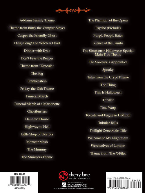 Halloween Spooktacular37 Gravest HitsPublisher: Cherry Lane MusicCategory: Keyboard & Piano/Vocal/GuitarSeries: Piano/Vocal/Guitar SongbookFormat: SoftcoverFeatures nearly 40 frightening faves: Addams Family Theme · Theme from Buffy the Vampire Slayer · Casper the Friendly Ghost · Don't Fear the...Regular price $23.99
