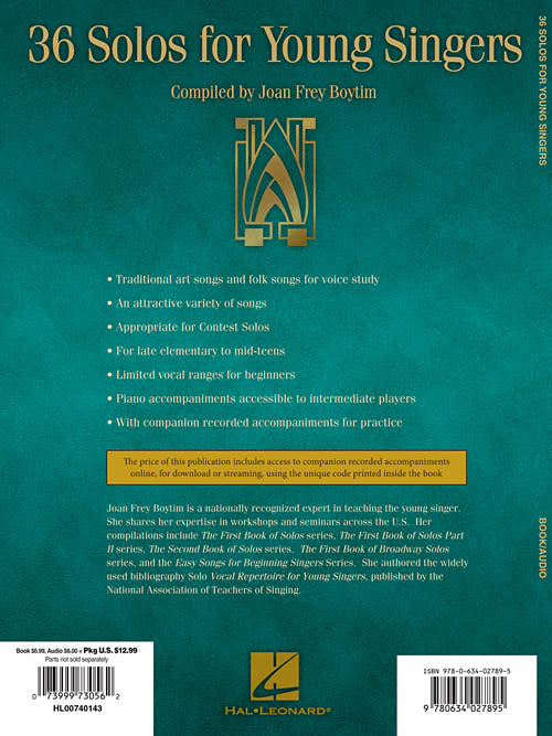 36 Solos for Young SingersPublisher: Hal LeonardCategory: VocalSeries: Vocal CollectionFormat: Softcover Audio OnlineResponsible for such popular series as The First Book of Solos, The Second Books of Solos and Easy Songs for Beginning Singers, Joan Frey...Regular price $22.99 -