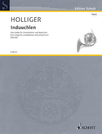 Composer: Heinz HolligerInduuchlenFour Songs for Countertenor and Natural HornPublisher: SchottCategory: VocalSeries: VocalFormat: SoftcoverThe four demanding songs of different character for countertenor with baritone tessitura and natural horn in F and E flat are based on the...Regular price $28.99 -