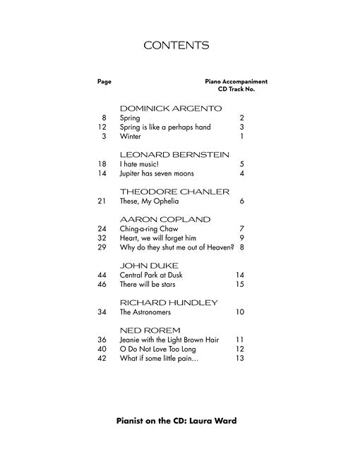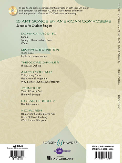 Composer: Various15 Art Songs by American ComposersHigh Voice, Book/CDPublisher: Boosey & HawkesCategory: VocalSeries: Boosey & Hawkes VoiceFormat: Softcover with CDA collection of works by major American song composers for voice students. Argento: Winter · Argento: Spring...Regular price $21.99 -