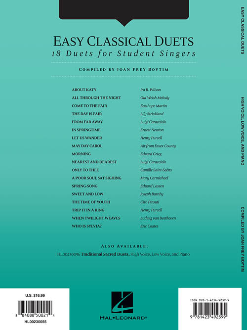 Composer: VariousEasy Classical Duets18 Duets for Student Singers High Voice, Low Voice, and PianoSoftcoverSecular duets appropriate for students of all ages. Including music by Beethoven, Grieg, Purcell, Saint-Saëns, and more. Easy to Intermediate Level. ...this collection...Regular price $21.99 -