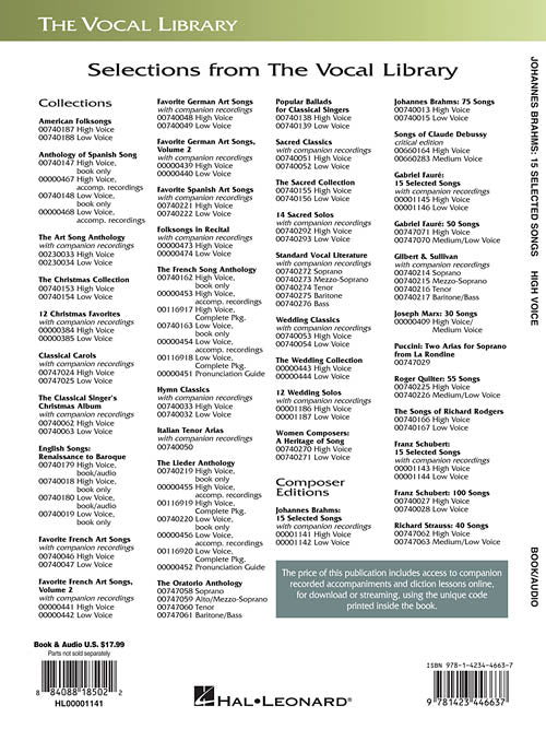 Johannes Brahms: 15 Selected SongsThe Vocal Library - High VoicePublisher: Hal LeonardCategory: VocalSeries: Vocal CollectionFormat: Softcover Audio Onlinewith online audio of diction lessons and piano accompaniments; includes historical notes, translations and International Phonetic Alphabet With diction...Regular price $21.99 -