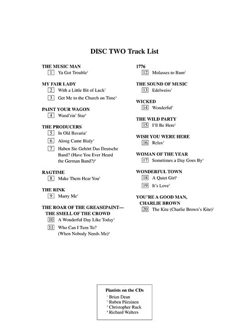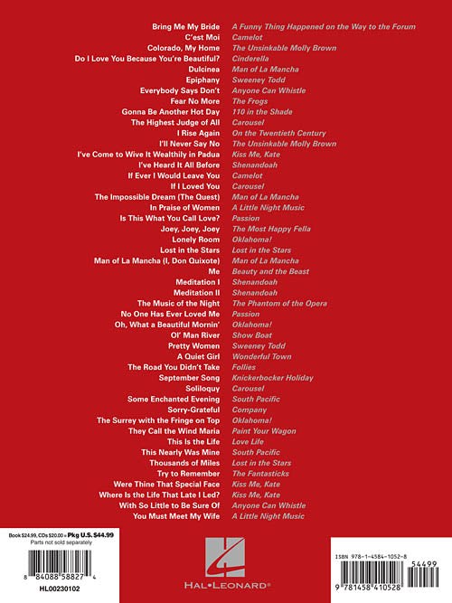 Composer: VariousMusical Theatre for Classical SingersBaritone/Bass Book/3-CDs PackSoftcover with CD47 songs. Contents: Bring Me My Bride (A Funny Thing Happened on the Way to the Forum) · C'est Moi (Camelot) · Colorado, My Home (The Unsinkable...Regular price $53.99