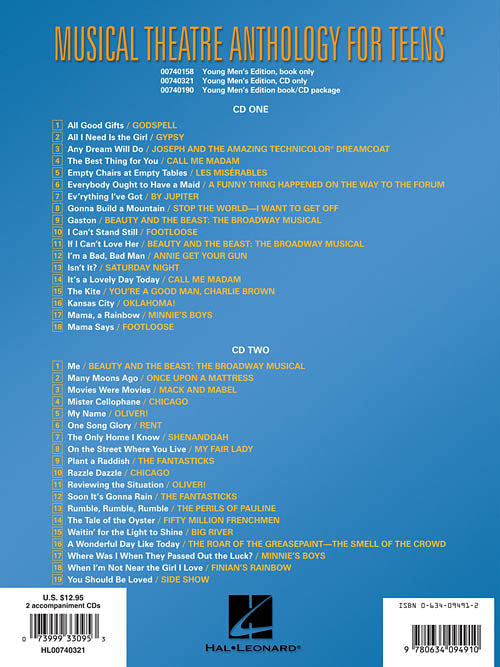 Composer: VariousMusical Theatre Anthology for TeensYoung Men's Edition - Accompaniment CD OnlyPublisher: Hal LeonardCategory: VocalSeries: Vocal CollectionFormat: Softcover with CDAn accompaniment CD is now available for the popular vocal folio. Contents: All Good Gifts (from the...Regular price $23.99 -