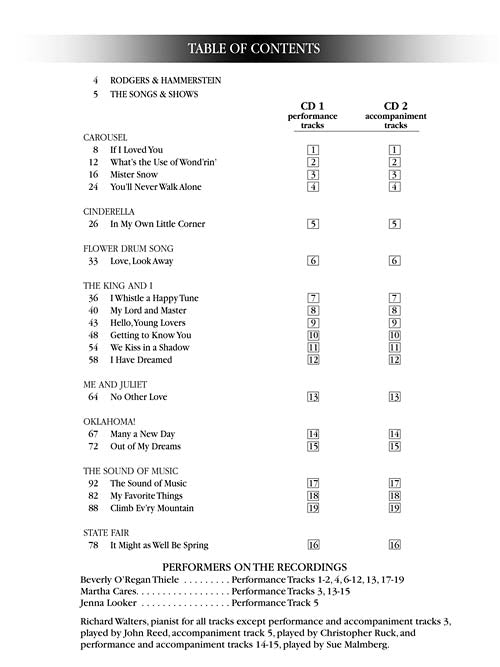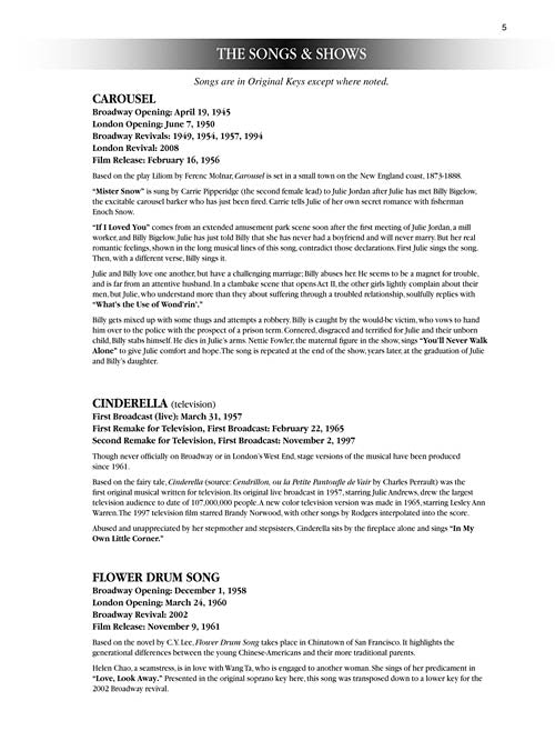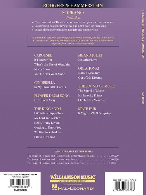 The Songs of Rodgers & HammersteinSopranoPublisher: Hal LeonardCategory: VocalSeries: Vocal CollectionFormat: Softcover Audio OnlineThe ultimate R&H source for singers, with a unique song list for each voice type. Each volume includes an introduction about each show...Regular price $29.99 -
