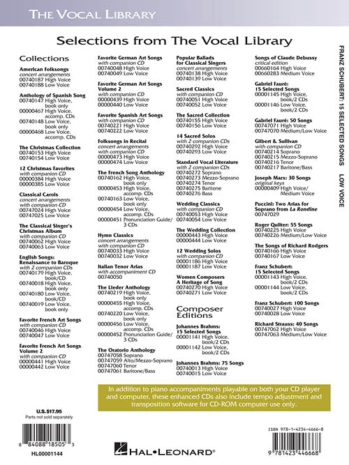 Franz Schubert - 15 Selected Songs (Low Voice)The Vocal Library - Low VoicePublisher: Hal LeonardCategory: VocalSeries: Vocal CollectionFormat: Softcover Audio Onlinewith online audio recordings of diction lessons and piano accompaniments; includes historical notes, translations and International...Regular price $23.99 -