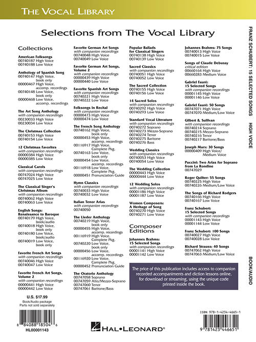 Franz Schubert - 15 Selected Songs (High Voice)The Vocal Library - High VoicePublisher: Hal LeonardCategory: VocalSeries: Vocal CollectionFormat: Softcover Audio OnlineIncludes historical notes, translations and International Phonetic Alphabet A collection of essential Schubert songs for students....Regular price $22.99 -