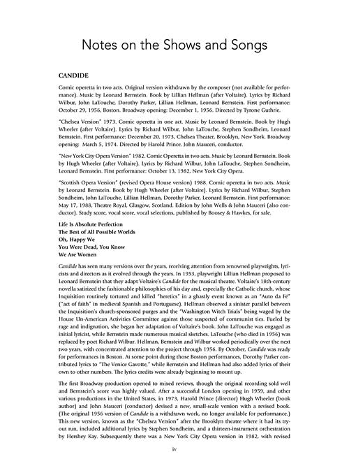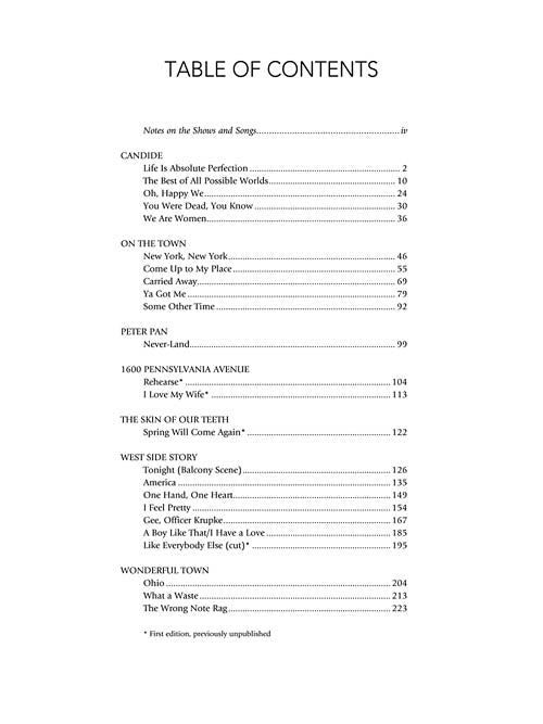 Composer: Leonard BernsteinBernstein Theatre SongsDuets & Ensembles, 24 SongsPublisher: Leonard Bernstein Music Publishing Co.Category: VocalSeries: VocalFormat: PaperbackFirst-time collection of Bernstein's theatre songs, with selections from Candide, Mass, On the Town, Peter Pan, 1600 Pennsylvania Avenue, West...Regular price $35.99 -