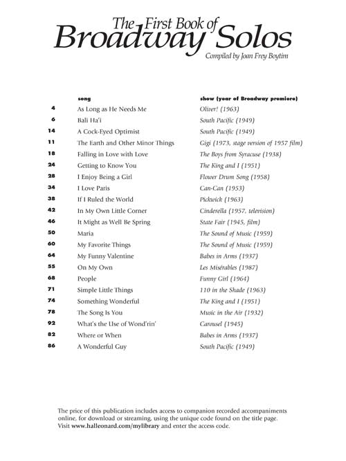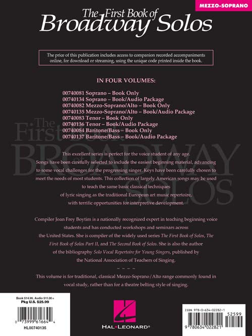 First Book of Broadway SolosMezzo-Soprano/Alto EditionPublisher: Hal LeonardCategory: VocalSeries: Vocal CollectionFormat: Softcover Audio OnlineJoan Boytim is the leading American expert in teaching young voices. In 1997 Hal Leonard released this four-volume series of Joan's excellent selections...Regular price $32.99 -