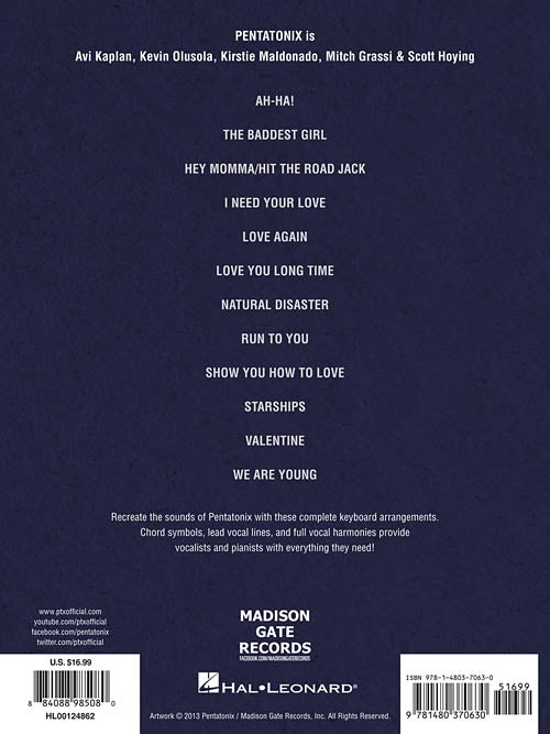 Pentatonix - PTXPublisher: Hal LeonardCategory: Keyboard & Piano/Vocal/GuitarSeries: Piano/Vocal/Guitar Artist SongbookFormat: SoftcoverWinners of the third season of NBC's The Sing-Off, this third album from Texas-based a cappella group Pentatonix is presented here in arrangements with chord...Regular price $23.99 -