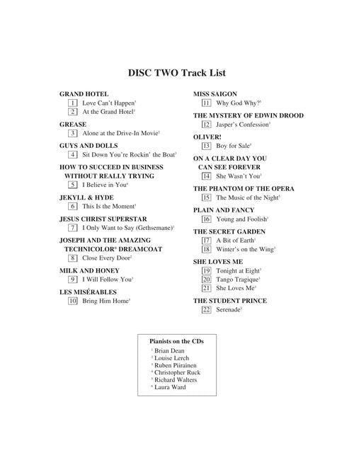 The Singer's Musical Theatre Anthology - Volume 2, RevisedTenor Accompaniment CDsPublisher: Hal LeonardCategory: VocalSeries: Vocal CollectionFormat: CDTwo accompaniment CDs in each package which match the books containing a collection of songs from the musical stage, categorized...Regular price $29.99 -