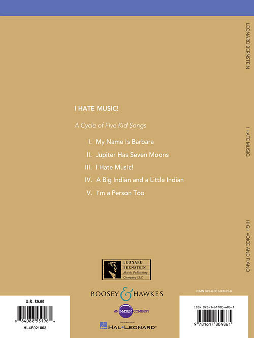 Composer: Leonard BernsteinI Hate Music!A Cycle of Five Kid Songs High VoicePublisher: Boosey & HawkesCategory: VocalSeries: Boosey & Hawkes VoiceFormat: SoftcoverNew music engravings available in two keys, with notes on the cycle. Contents: I. My Name...Regular price $15.99 -