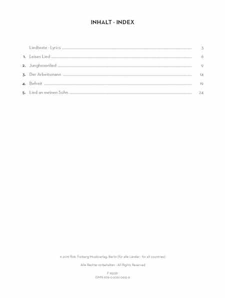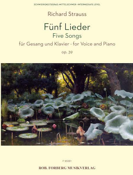 Composer: Richard Strauss5 Songs, Op. 39Voice and PianoPublisher: Ricordi MunichCategory: VocalSeries: Vocal SoloFormat: SoftcoverThe complete opus 39 for voice and piano by R. Strauss. Contents: Leises Lied, Junghexenlied, Der Arbeitsmann, Befreit, Lied an meinen Sohn. Texts...Regular price $21.99 -