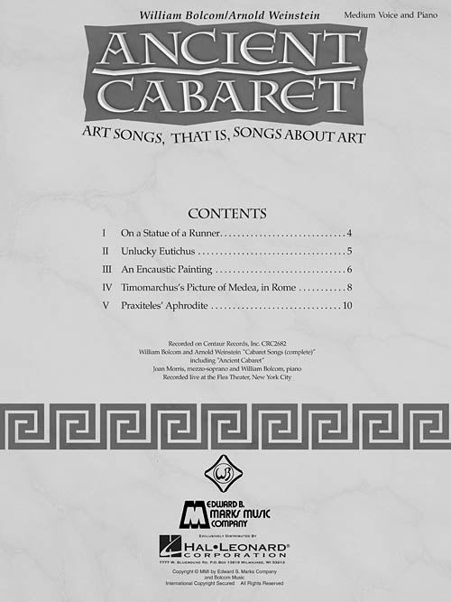 Composer: William BolcomAncient CabaretMedium Voice and PianoThis collection of 5 art songs comes from Ancient Greek poetry. The music was written by William Bolcom and the poems were translated into English by Arnold Weinstein. Songs: On...Regular price $13.99 -
