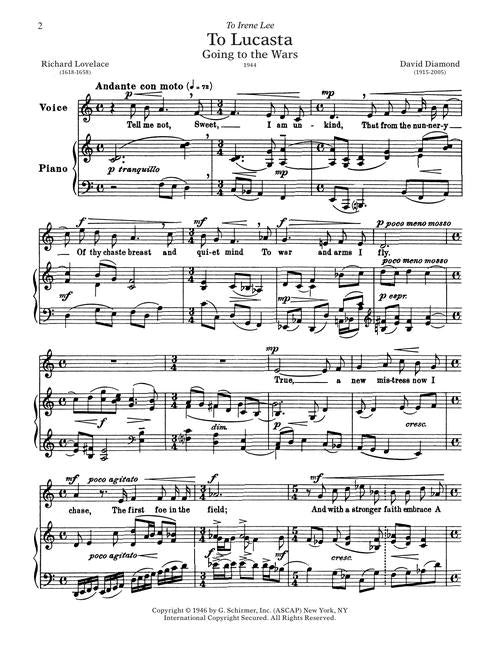Composer: David DiamondTo Lucasta (On Going to Wars)Voice and PianoPublisher: AssociatedCategory: ClassicalSeries: Vocal SoloFormat: SoftcoverSheet MusicInventory # : 50488977UPC: 196288077336ISBN: 1705167101Width: 8.5"Length: 11"Height: 0.011"Product Weight: 0 lbs.Number of Pages: 4 Condition: New Item# 50488977 Authorized DealerRegular price $5.99 -