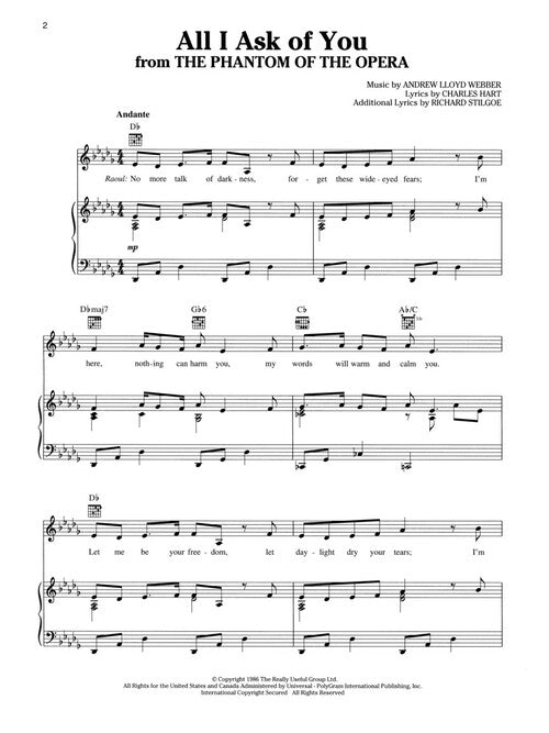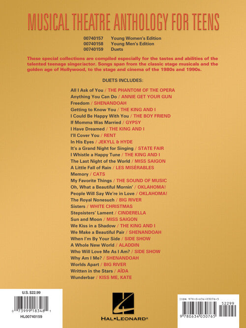 Arranger: Louise LerchMusical Theatre Anthology for TeensDuets EditionPublisher: Hal LeonardCategory: VocalSeries: Vocal CollectionFormat: SoftcoverSongs include: All for the Best (from Godspell) · All I Ask of You (from The Phantom of the Opera) · Anything You...Regular price $27.99 -