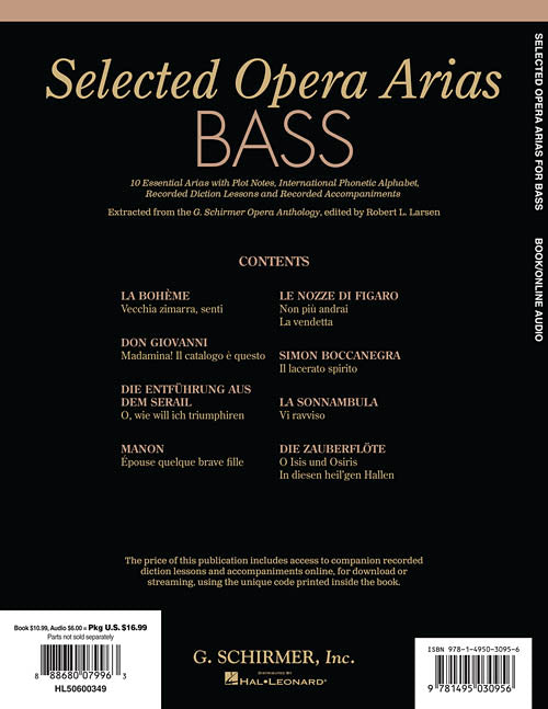 Selected Opera AriasBass EditionPublisher: G. Schirmer, Inc.Category: VocalSeries: Vocal CollectionFormat: Softcover Audio Online10 essential arias with plot notes, IPA, recorded diction lessons and recorded accompaniments. The price of the book includes access to companion recorded diction...Regular price $20.99 -