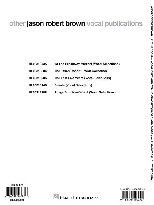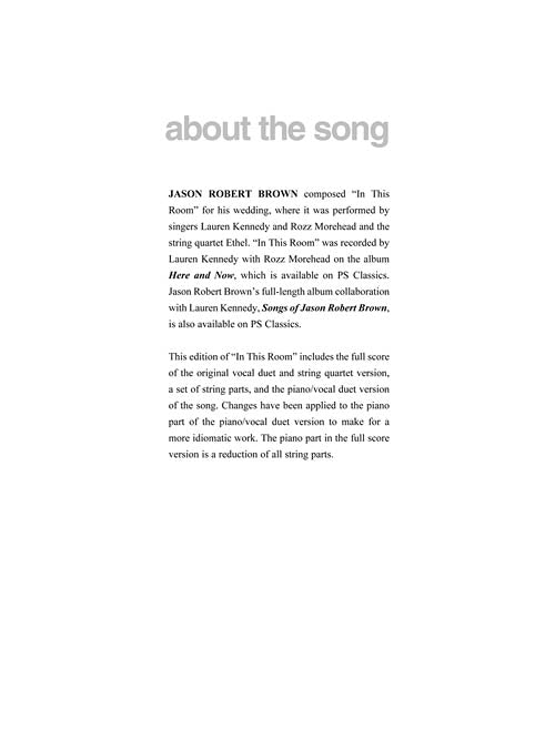 Composer: Jason Robert BrownJason Robert Brown - In This RoomVocal Duet and String Quartet plus Piano/Vocal Duet Version Score and PartsSoftcoverScore & PartsMusical theatre composer Jason Robert Brown wrote In This Room to be performed at...Regular price $17.99