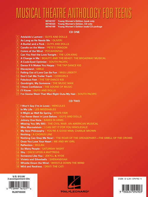Musical Theatre Anthology for TeensYoung Women's Edition - Accompaniment CD OnlyPublisher: Hal LeonardCategory: VocalSeries: Vocal CollectionFormat: CDAn accompaniment CD is now available for the popular vocal folio. Contents: Adelaide's Lament (from GUYS AND DOLLS) · As...Regular price $29.99 -
