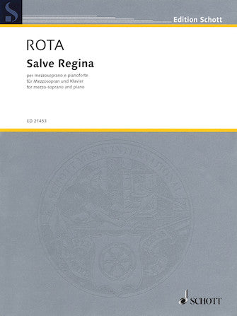 Composer: Nino RotaSalve Reginafor Mezzo-Soprano and PianoPublisher: SchottCategory: VocalSeries: VocalFormat: PaperbackSalve Regina for Mezzo-Soprano and PianoInventory # : 49044142UPC: 888680036980ISBN: Width: 9"Length: 12"Height: 0.069"Product Weight: 0.1 lbs.Number of Pages: Condition: New Item# 49044142 Authorized DealerRegular price $13.99 -