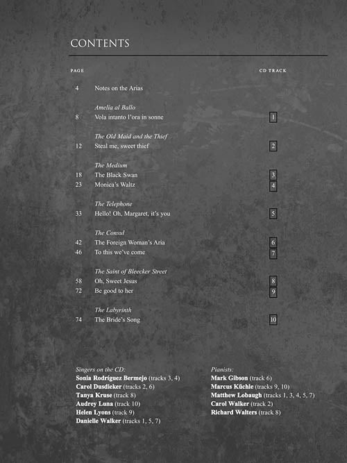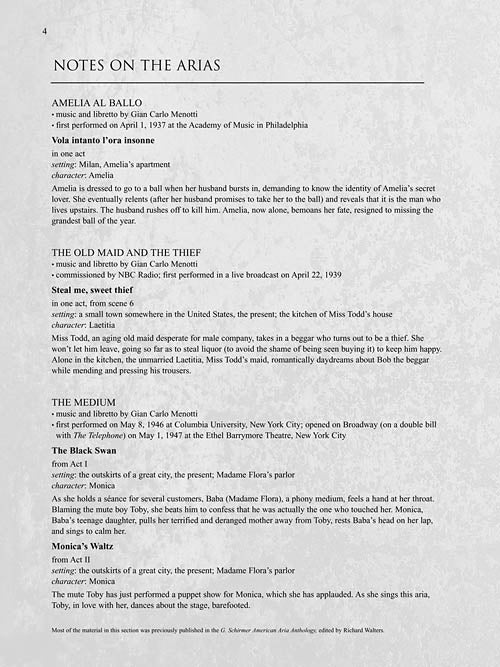 Menotti Arias for Soprano10 Arias from 7 OperasPublisher: G. Schirmer, Inc.Category: VocalSeries: Vocal CollectionFormat: Softcover with CD10 arias: Amelia al ballo: Vola intanto l'ora insonne · The Consul: The Foreign Woman's Aria · To this we've...Regular price $23.99 -