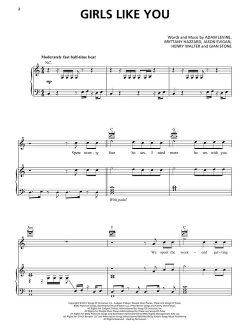 Girls Like YouPublisher: Hal LeonardCategory: Keyboard & Piano/Vocal/GuitarSeries: Piano VocalFormat: SoftcoverThis sheet music features an arrangement for piano and voice with guitar chord frames, with the melody presented in the right hand of the piano part...Regular price $4.99 -