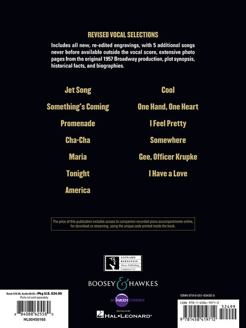 West Side StoryPiano/Vocal Selections with Piano Accompaniment RecordingPublisher: Boosey & HawkesCategory: VocalSeries: Vocal SelectionsFormat: Softcover Audio OnlineSing along with the music from West Side Story! Complete vocal selections with extensive notes, photos, and online audio access...Regular price $35.99 -