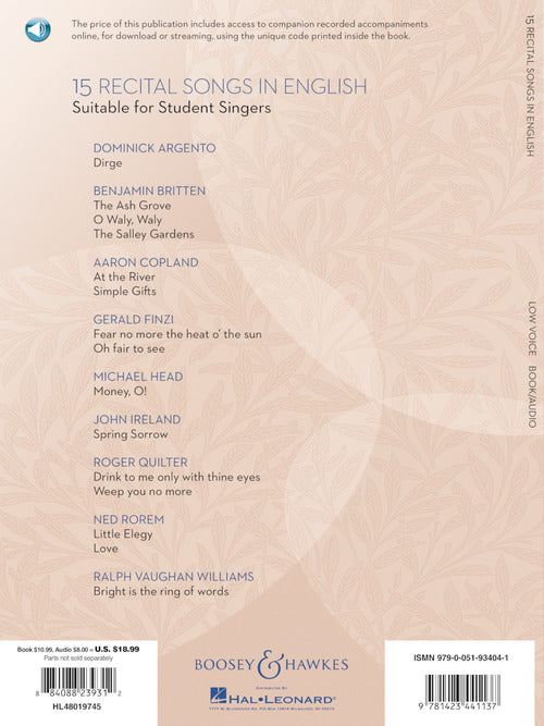 15 Recital Songs in EnglishLow VoicePublisher: Boosey & HawkesCategory: VocalSeries: Boosey & Hawkes VoiceFormat: Softcover Audio OnlineA collection of American and British songs especially suitable for student singers, with songs by Dominick Argento, Benjamin Britten, Aaron...Regular price $23.99 -