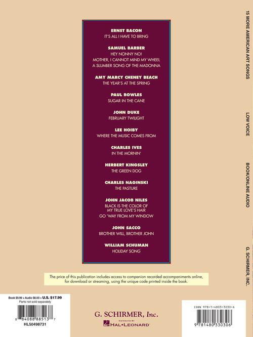15 More American Art SongsLow Voice With Recordings of Piano AccompanimentsPublisher: SchirmerCategory: VocalSeries: Vocal SoloFormat: Softcover Audio OnlineAn excellent selection of art songs for student singers, including songs by Barber, Beach, Duke, Hoiby, Ives, Niles, Schuman,...Regular price $23.99 -
