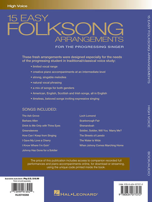 15 Easy Folksong ArrangementsHigh Voice Introduction by Joan Frey BoytimPublisher: Hal LeonardCategory: VocalSeries: Vocal CollectionFormat: Softcover Audio OnlineThis collection is designed for those students, of any age beyond early teens, in the early stages of voice...Regular price $22.99