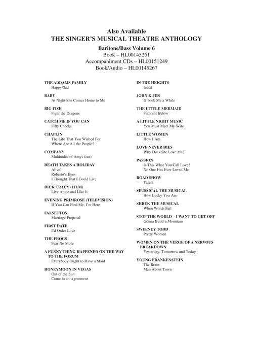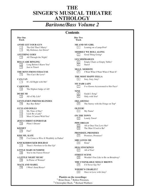 The Singer's Musical Theatre Anthology - Volume 2, RevisedBaritone/Bass Accompaniment CDsPublisher: Hal LeonardCategory: VocalSeries: Vocal CollectionFormat: CDTwo accompaniment CDs in each package which match the books containing a collection of songs from the musical stage, categorized...Regular price $32.99 -