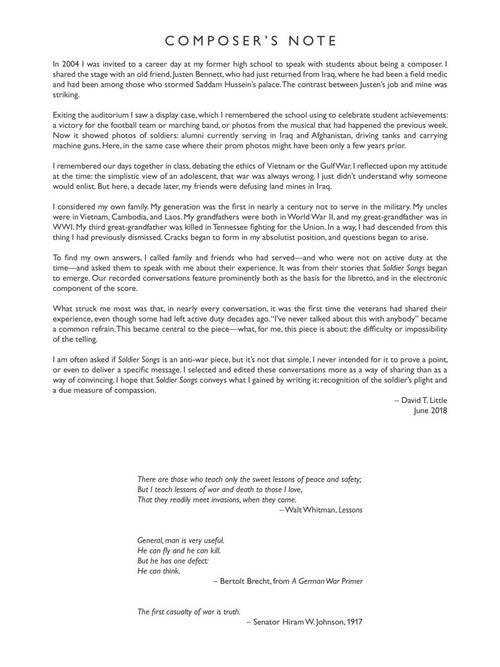 Composer: David T. LittleSoldier SongsAn Opera in the Form of a Song CyclePublisher: Boosey & HawkesCategory: VocalSeries: BH Stage WorksFormat: SoftcoverSoldier Songs An Opera in the Form of a Song CycleInventory # : 48024573UPC: 888680916763ISBN: 1540047121Width:...Regular price $35.99 -