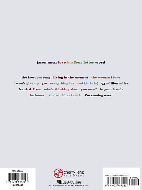 Jason Mraz - Love Is a Four Letter WordPublisher: CHERRY LANE MUSICCategory: Keyboard & Piano/Vocal/GuitarSeries: Piano/Vocal/Guitar Artist SongbookFormat: SoftcoverMatching folio to Mr. A-Z's 2012 chart-topping release. Includes: Everything Is Sound · The Freedom Song · I...Regular price $23.99 -