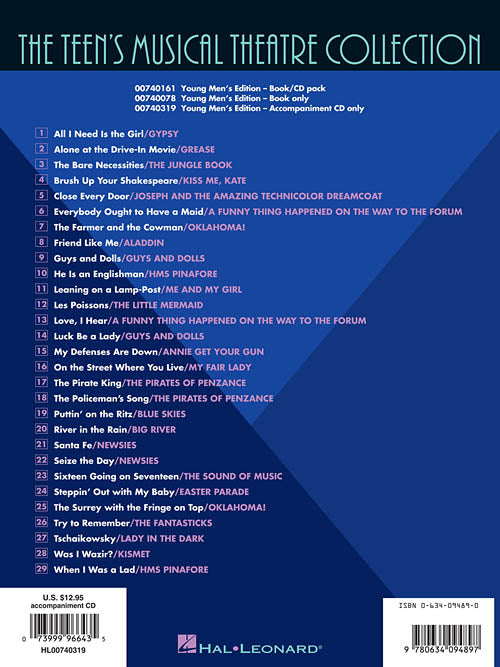The Teen's Musical Theatre CollectionYoung Men's EditionPublisher: Hal LeonardCategory: VocalSeries: Vocal CollectionFormat: CDThis is the accompaniment CD for practicing the hit vocal series! With almost 30 great songs in each volume from the stage and movie...Regular price $21.99