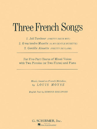 3 French SongsSSATBPublisher: G. Schirmer, Inc.Category: ClassicalSeries: Vocal CollectionFormat: PaperbackWith 2 piccolos or flutes and piano. Contents: 1. Joli Tambour (Pretty Drum Boy) · 2. O Ma Tendre Musette (O my gentle Musette) · 3. Gentle...Regular price $7.99